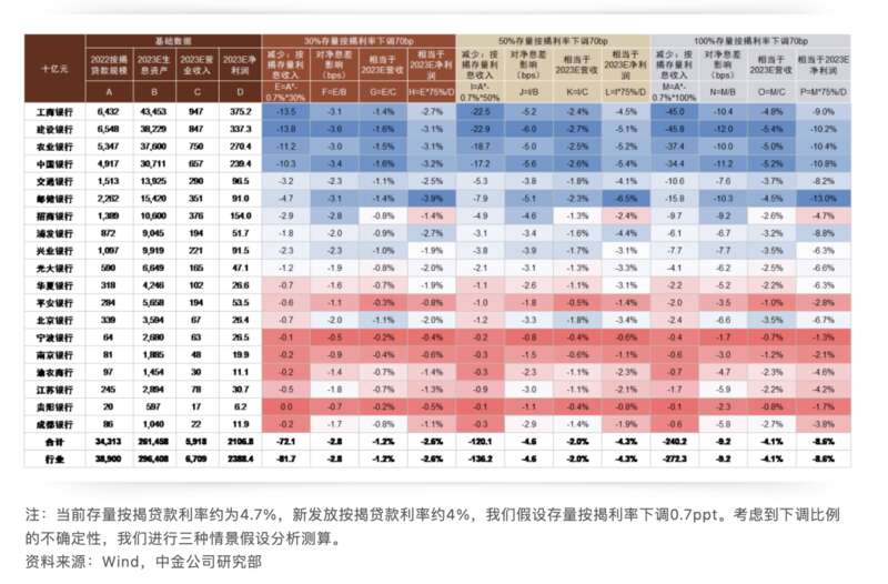 据中金公司货币金融分析部林英奇团队预计,以下调比例分别为30%、50%、100%来测算,存量按揭利率下调70bp后,2023年净息差将分别下降3bp、5bp、9bp。