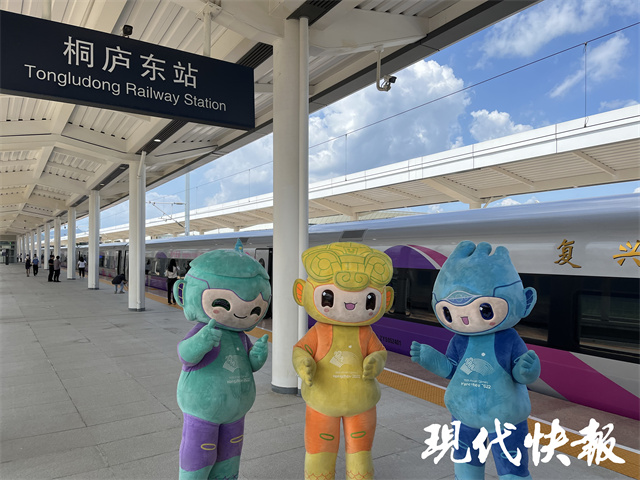 此次,亚运会吉祥物组合“江南忆”也随车打卡,身着吉祥物萌服的演出人员在车厢内迎客,吸引众人目光;列车经停德清站、杭州西站、桐庐东站期间,不少体验者下车与吉祥物合影,氛围轻松热烈。