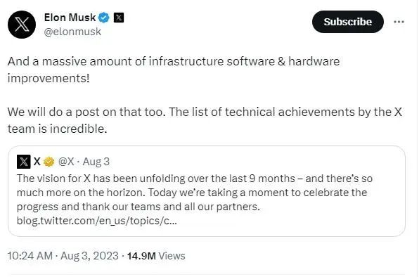 2023年4月,马斯克将推特的法定名称更改为“X”。