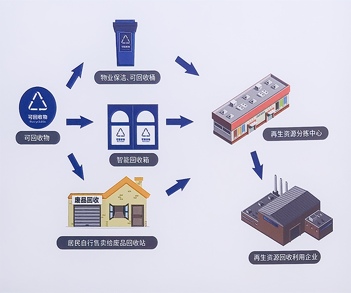在“全国生活垃圾分类宣传教育基地”泉城路街道垃圾分类体验中心,记者了解到可回收物的回收流程:居民自行将可回收物卖给废品回收站,或将其分类投放至可回收箱由垃圾分类转运站集中收集,物业保洁、拾荒者将可回收物捡拾收集,通过这三种途径的前期收集,将可回收物集中流入再生资源分拣中心,经过分拣处理流通至再生资源回收利用企业。