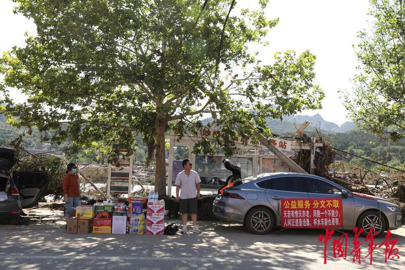 8月5日,北京市门头沟区妙峰山镇丁家滩公交站前,志愿者何诚(右)和鄢大姐为来往的人员免费提供水和食物。何诚家住北京丰台,以前周末常来丁家滩附近郊游,这几天他利用休年假的时间来到这里帮助当地受灾居民。鄢大姐也是自发从北京市其他区赶来的,他们希望尽自己所能为灾区做点事情。