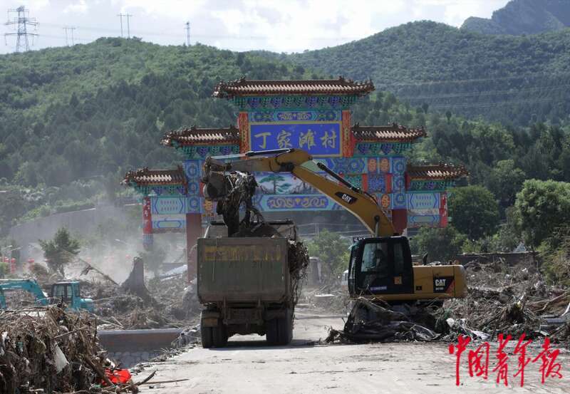 8月5日,北京市门头沟区妙峰山镇丁家滩村村口,工程机械正在清理洪灾后的垃圾。