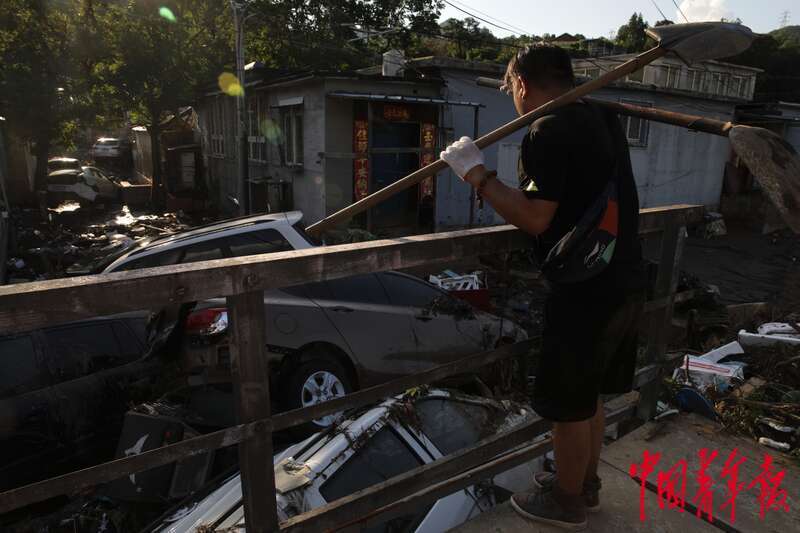8月5日,北京市门头沟区妙峰山镇丁家滩村,村民李先生干完清理淤泥的活儿后,扛着铁锨经过京门铁路的铁路桥,看着桥下被冲毁的汽车,沉默良久。