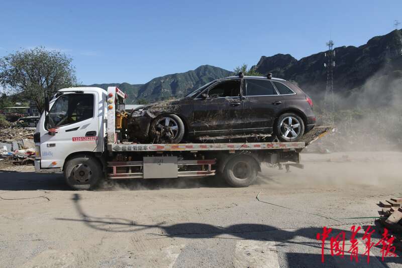 8月5日,北京市门头沟区妙峰山镇丁家滩村,救援车辆拖着被洪水浸泡过的车辆,前往修车厂。
