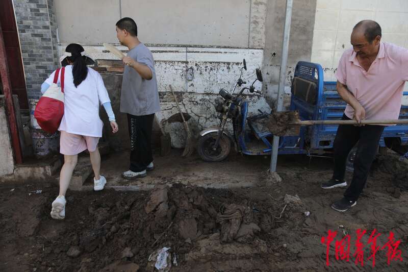 8月5日,北京市门头沟区妙峰山镇丁家滩村,村民杨继明(右一)正在清理自家门口的淤泥。他说,洪水来袭的时候,家门前的农用车都漂了起来,要不是有链子锁着早就被冲跑了。他这几天在位于海淀区的儿子家住,当天临时回来收拾屋子,等村子一切回复正常了,再带老伴儿回来。
