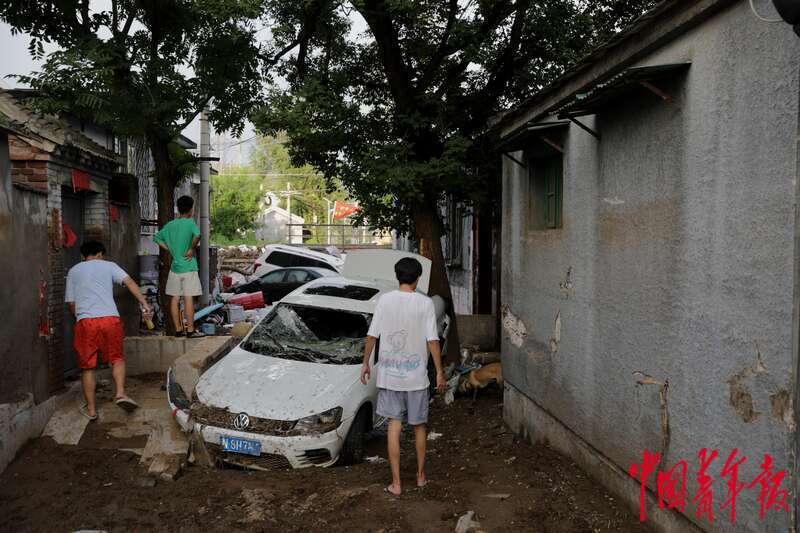 8月5日,北京市门头沟区妙峰山镇丁家滩村,几位年轻人帮亲戚朋友找寻被冲毁的汽车。