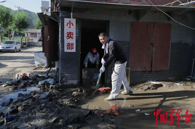 8月5日,北京市门头沟区妙峰山镇丁家滩村,村民刘大哥在朋友的小卖铺前帮忙清理淤泥。