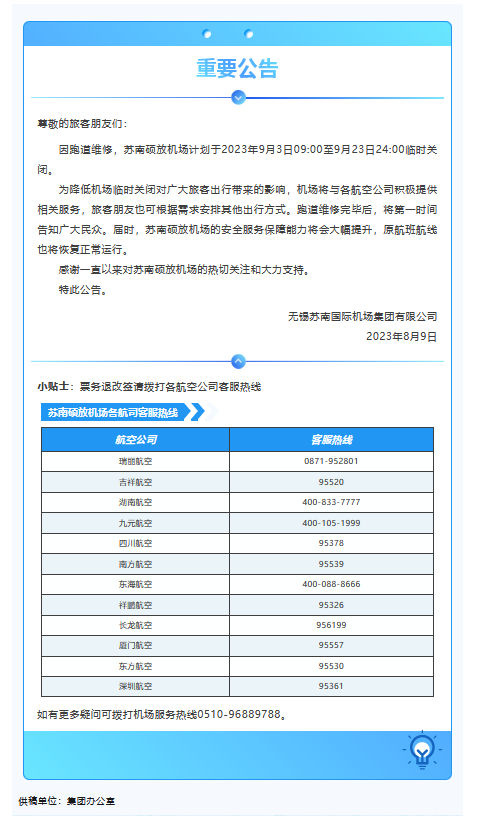 因跑道维修,苏南硕放机场计划于2023年9月3日09:00至9月23日24:00临时关闭。