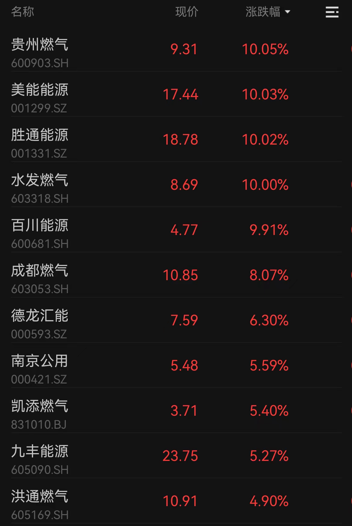 8月10日,燃气板块走强