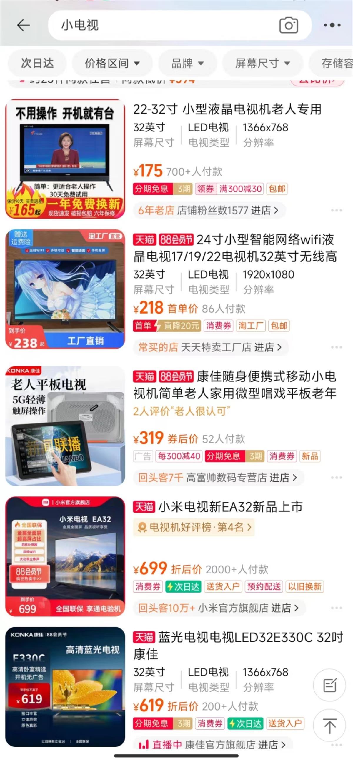 “买的主要是老人,还有就是三四线城市的消费者居多。”一家经营小尺寸电视的商家告诉记者,小尺寸电视卖得比较好的是43英寸、32英寸,一个月可以卖几十、上百单,单台价格多在几百元左右,“售后的话,需要您直接联系厂家,我们店铺不负责售后的。”