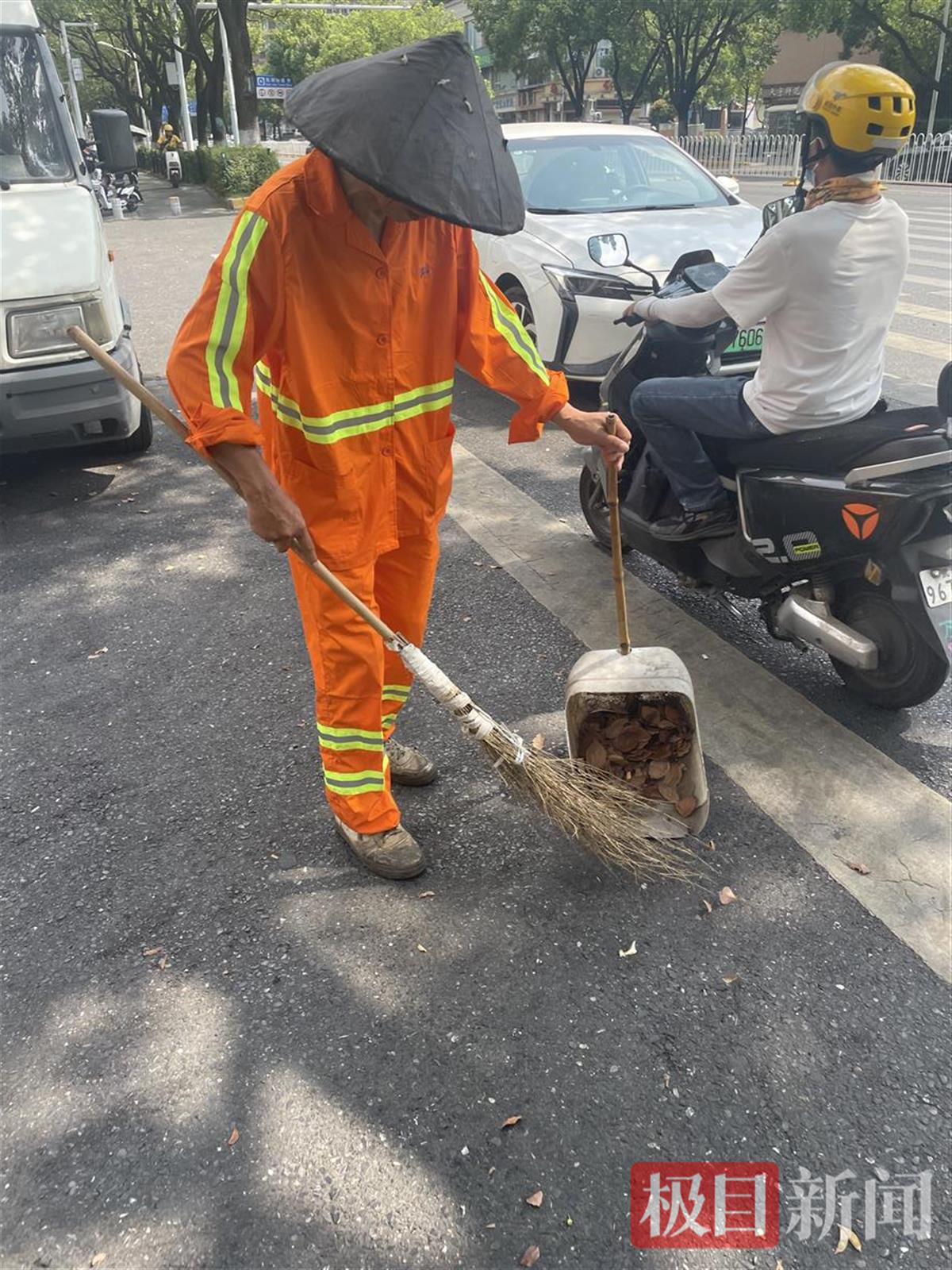 在民族大道上,环卫工人正在清扫路面的樟树叶片,扫了一撮箕叶片,引起过往行人的关注,这是秋风扫落叶了吗?
