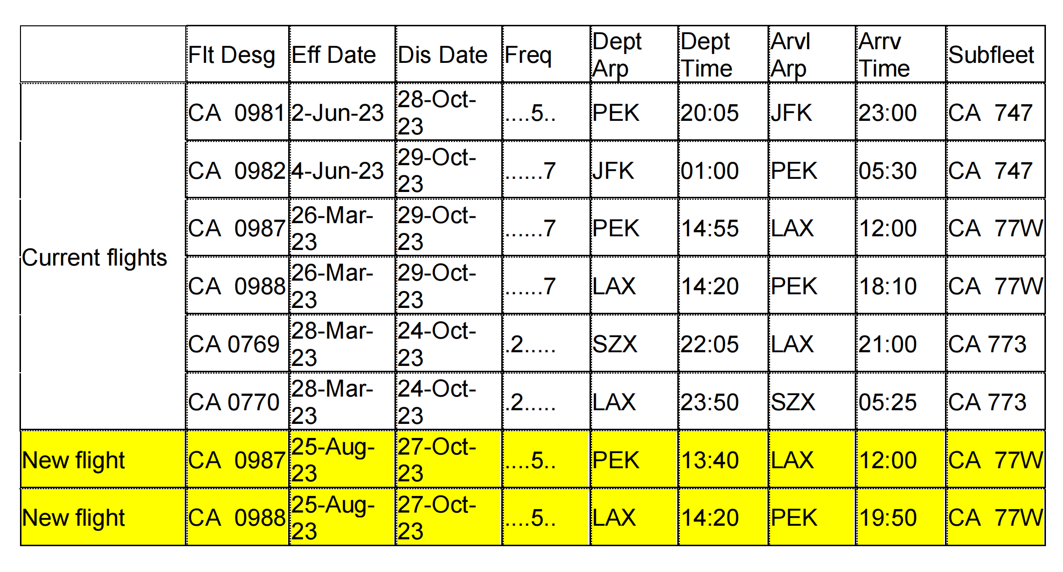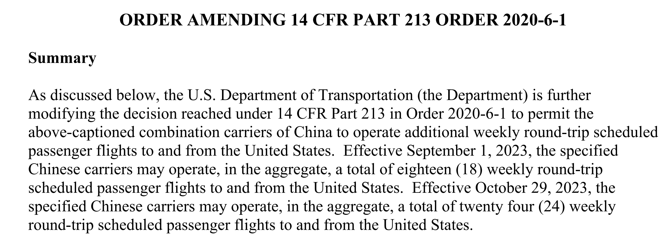 今年5月3日,美国交通部时隔三年首次宣布新增中美直飞航班,称允许中国航司每周运营12班中美往返定期航班,这意味着中国航司和美国航司运营的中美往返航班数量将实现对等,达到每周24班,上一次中国航司增加美国航班已经是2020年8月。