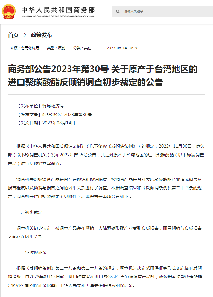 商务部网站14日发布关于原产于台湾地区的进口聚碳酸酯反倾销调查初步裁定的公告,公告提到,调查机关初步认定,被调查产品存在倾销,大陆聚碳酸酯产业受到实质损害。