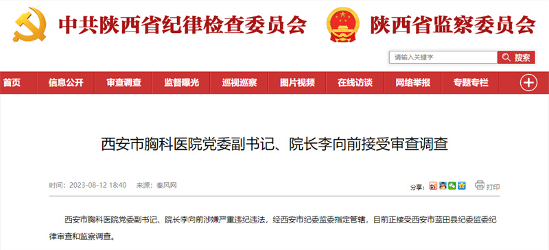 根据公开报道,除了8月14日一天两个三甲医院前领导被查之外。上一周(8月7日-13日),连续6天有医疗系统干部落马的消息通报。其中8月12日,陕西省纪委监委“秦风网”通报,西安市胸科医院党委副书记、院长李向前涉嫌严重违纪违法,经西安市纪委监委指定管辖,目前正接受西安市蓝田县纪委监委纪律审查和监察调查。