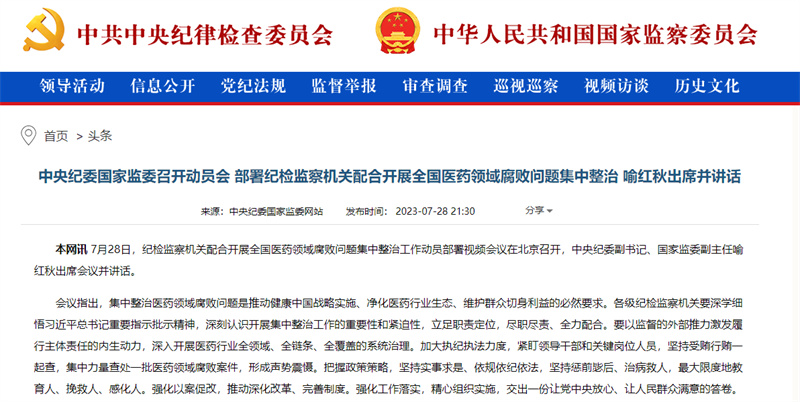 另据中央纪委国家监委网站消息,7月28日,纪检监察机关配合开展全国医药领域腐败问题集中整治工作动员部署视频会议召开。会议提到,“深入开展医药行业全领域、全链条、全覆盖的系统治理”“紧盯领导干部和关键岗位人员,坚持受贿行贿一起查,集中力量查处一批医药领域腐败案件,形成声势震慑”。