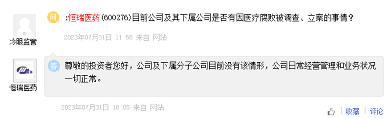 现代快报记者在上证e互动平台上看到,早在7月底,就有投资者询问恒瑞医药及其下属公司是否有因医疗腐败被调查、立案的事情。恒瑞医药回复称,公司及下属分子公司目前没有该情形,公司日常经营管理和业务状况一切正常。8月9日,恒瑞医药对于网传“办公室被抄”传言在投资者互动平台上表示,近期传言不属实,公司及下属分子公司、及所有派驻机构没有该情形,公司已向公安机关报案,并得到受理。同时,恒瑞医药在该平台上表示,医药反腐有助于医药行业健康化、规范化、高质量发展。