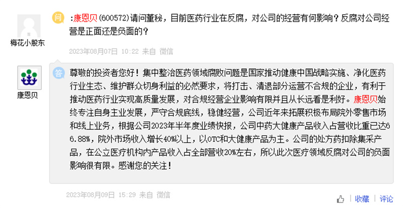 8月7日,康恩贝回复当前医药行业反腐对公司经营的影响时表示,集中整治医药领域腐败问题是国家推动健康中国战略实施、净化医药行业生态、维护群众切身利益的必然要求,将打击、清退部分运营不合规的企业,有利于推动医药行业实现高质量发展,对合规经营企业影响有限并且从长远看是利好。康恩贝表示此次医疗领域反腐对公司的负面影响很有限。