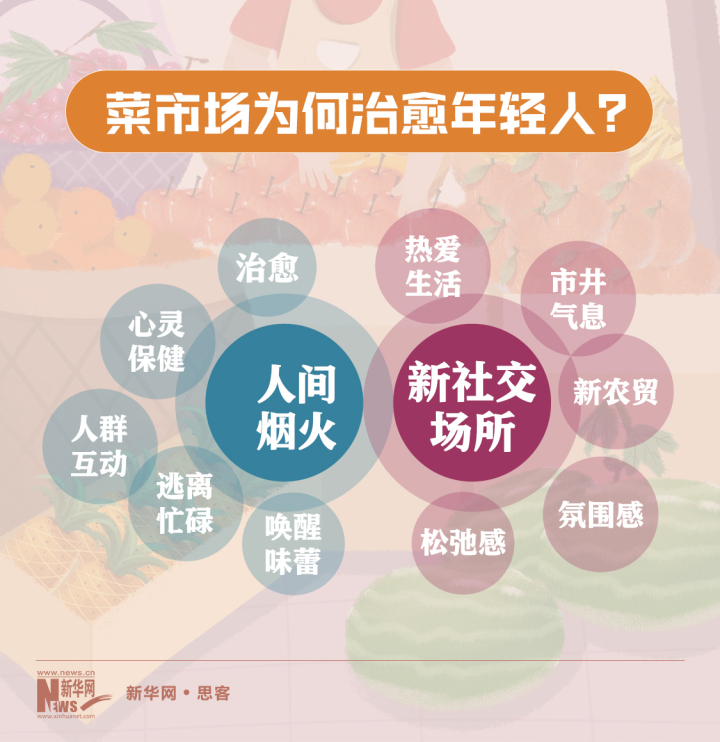 第三,菜市场正变得越发精致年轻。越来越多的设计师、策展人和画家把目光投向菜市场。北京三源里、上海乌中集市等地积极创新,将设计、绘画、书法等元素融入菜市场,带来生活与艺术的奇妙碰撞,打造时髦和潮流的烟火气。别致的印花包装、俏皮的美术字体、接地气的标语和告示……在这些“新型集市”,一次采购就是一段艺术之旅,独特的艺术符号和美感体验是吸引年轻游客纷至沓来的重要原因。