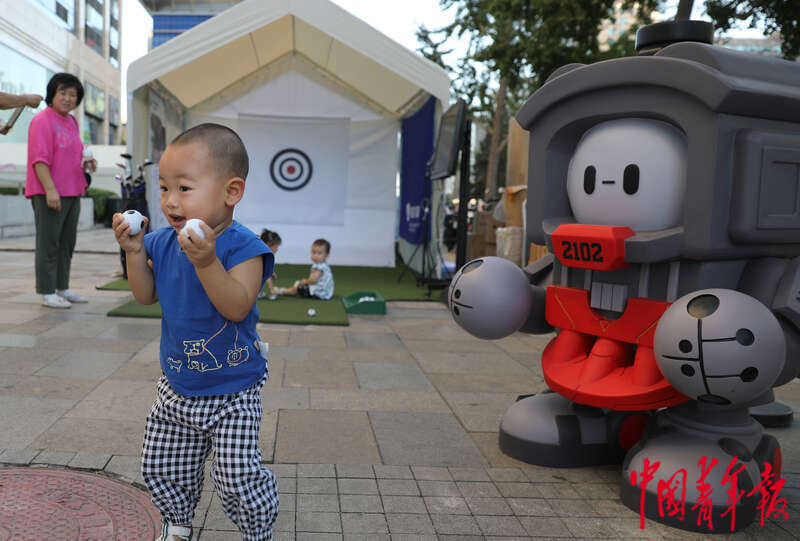 8月18日,北京市东城区崇文门商圈,小朋友在游戏互动区玩耍。中青报·中青网记者陈剑/摄