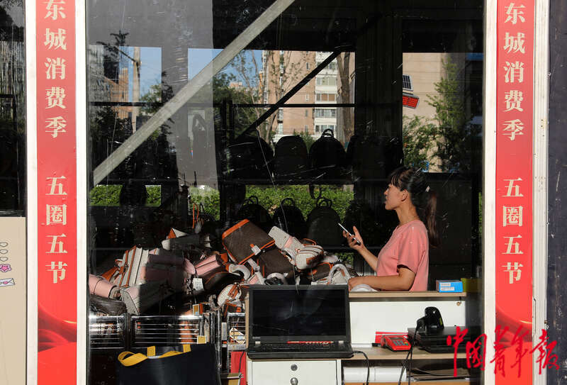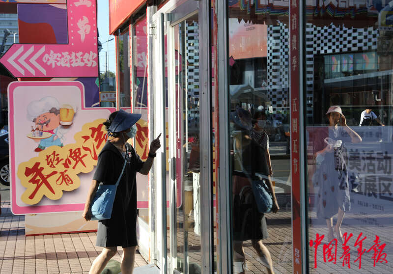 8月18日,北京市东城区崇文门商圈,一位消费者正准备推门进入一处商场。当日,一场促进夏日消费的文化生活节在这里启动。据介绍,本次活动将持续近8周,跨越多个节日节点,致力呈现集美食精酿、京彩雅集、品牌活动、潮流体育、公益展区、惠民演出等于一体的多元消费新场景。通过丰富多样的活动板块、精彩纷呈的活动内容,借助商业综合体的人气优势,持续为商圈引流赋能,为市民群众带来良好体验,推动暑期经济、夜间经济以及沉浸式、体验式消费热潮。中青报·中青网记者陈剑/摄
