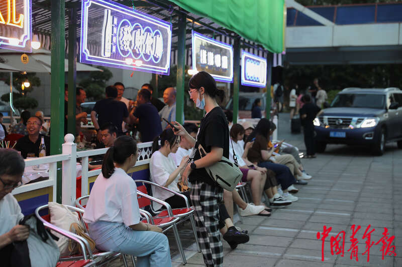 8月18日,北京市东城区崇文门商圈,消费者正在夜市大排档前等位准备就餐。据了解,随着崇文门商圈被评为北京市“夜京城”品质消费生活圈,这里已逐渐成为夜间经济新的打卡地。中青报·中青网记者陈剑/摄