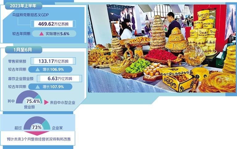 乌兹别克斯坦统计局初步数据显示,截至2023年7月1日,该国从事零售业的商业企业数量达到95392家,其中大型企业318家,中小型企业数量达95074家。1月至6月该国零售贸易额达到133.17万亿苏姆,较去年同期增长106.9%。截至2023年7月1日,乌兹别克斯坦公共餐饮领域经营企业数量达24504家,其中大型经营企业177家,中小型企业数量达24327家。1月至6月,该国餐饮企业营业额达6.63万亿苏姆,较去年同期增长107.9%,其中75.4%的营业额来自中小型企业。
