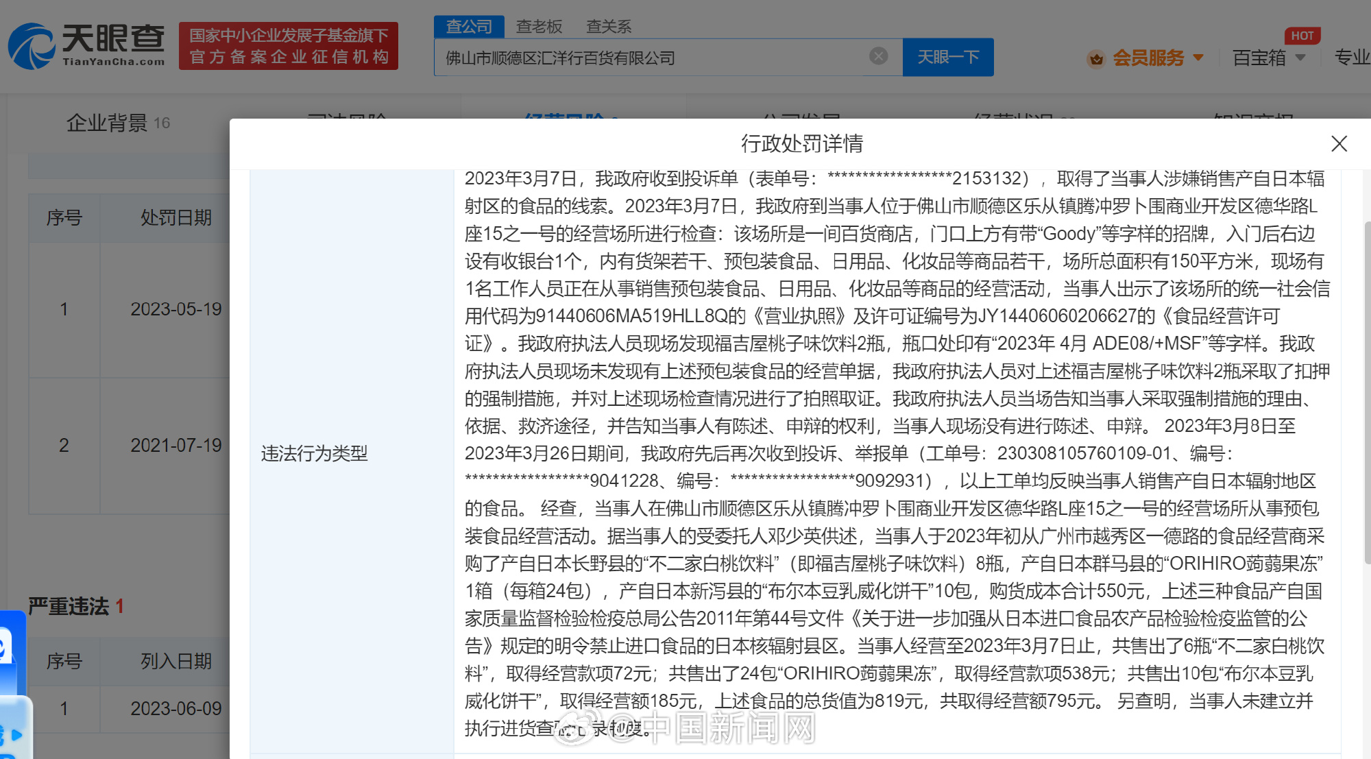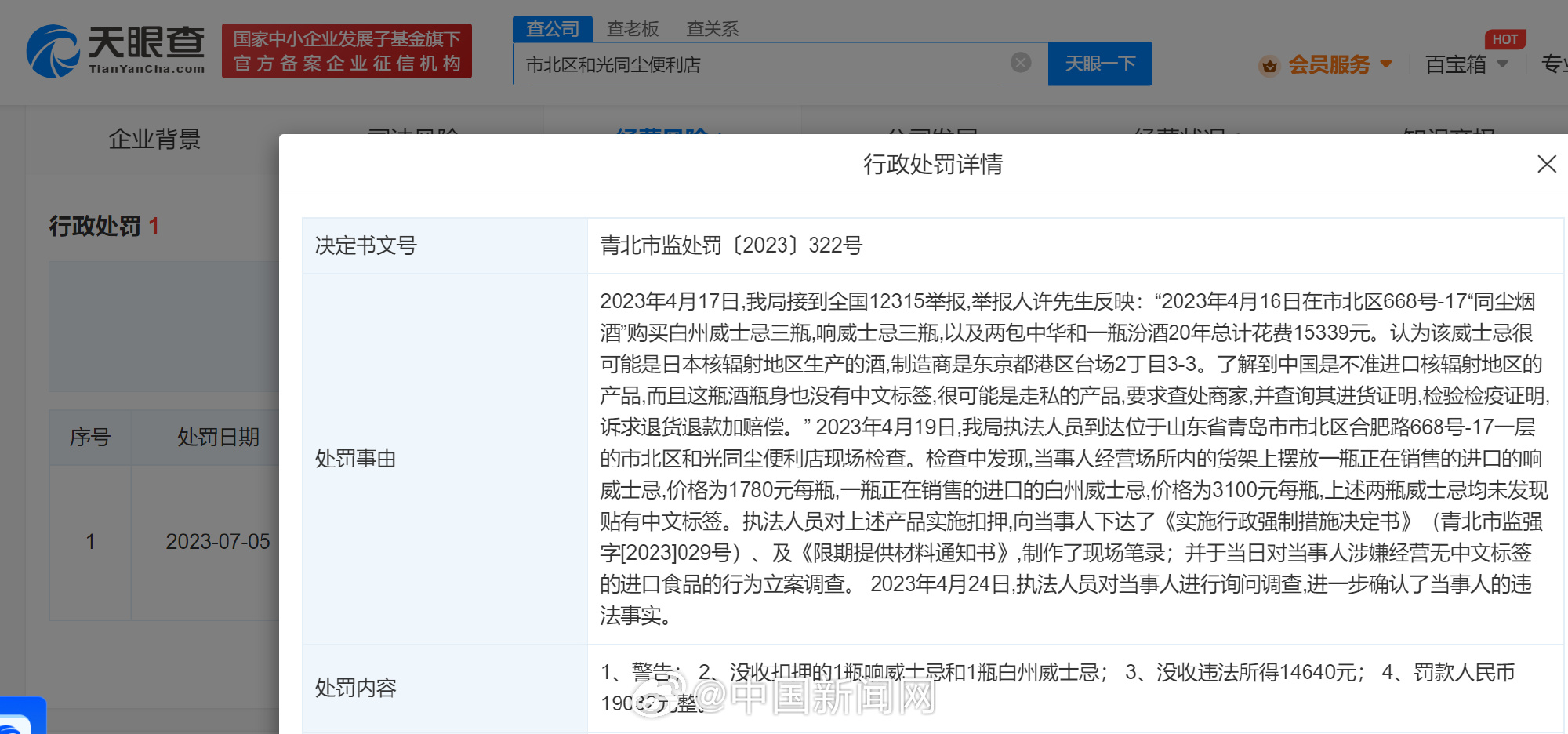 天眼查显示,曾有多个商家售卖日本核辐射区食品饮料被处罚。其中,浙江购加兴新零售科技有限公司阳光西路分公司因经营来自日本核辐射区的多种食品被责令改正;佛山市顺德区汇洋行百货有限公司因销售采购产自日本长野县的饮料等被监管部门罚款1万,后被列入严重违法失信企业名单;成都神乐町餐饮有限公司因销售来自核辐射区日本福岛县的“大七酒”被罚款3万;青岛市市北区和光同尘便利店因涉嫌销售日本核辐射地区生产的威士忌酒被罚款1.9万余元。