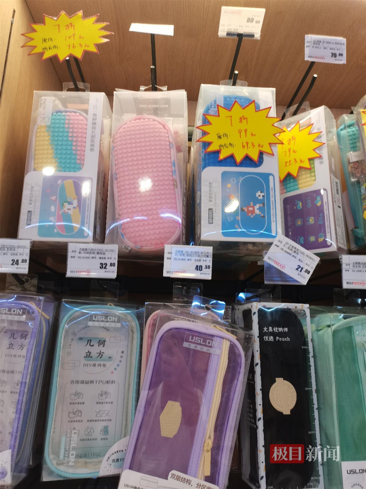 8月23日,极目新闻记者走访了武汉市多家文具店发现,售价30多元的笔类产品随处可见,联名款价格更甚。笔袋、本子的售价也可达上百元。而且这类文具一般摆放在较为显眼的位置。