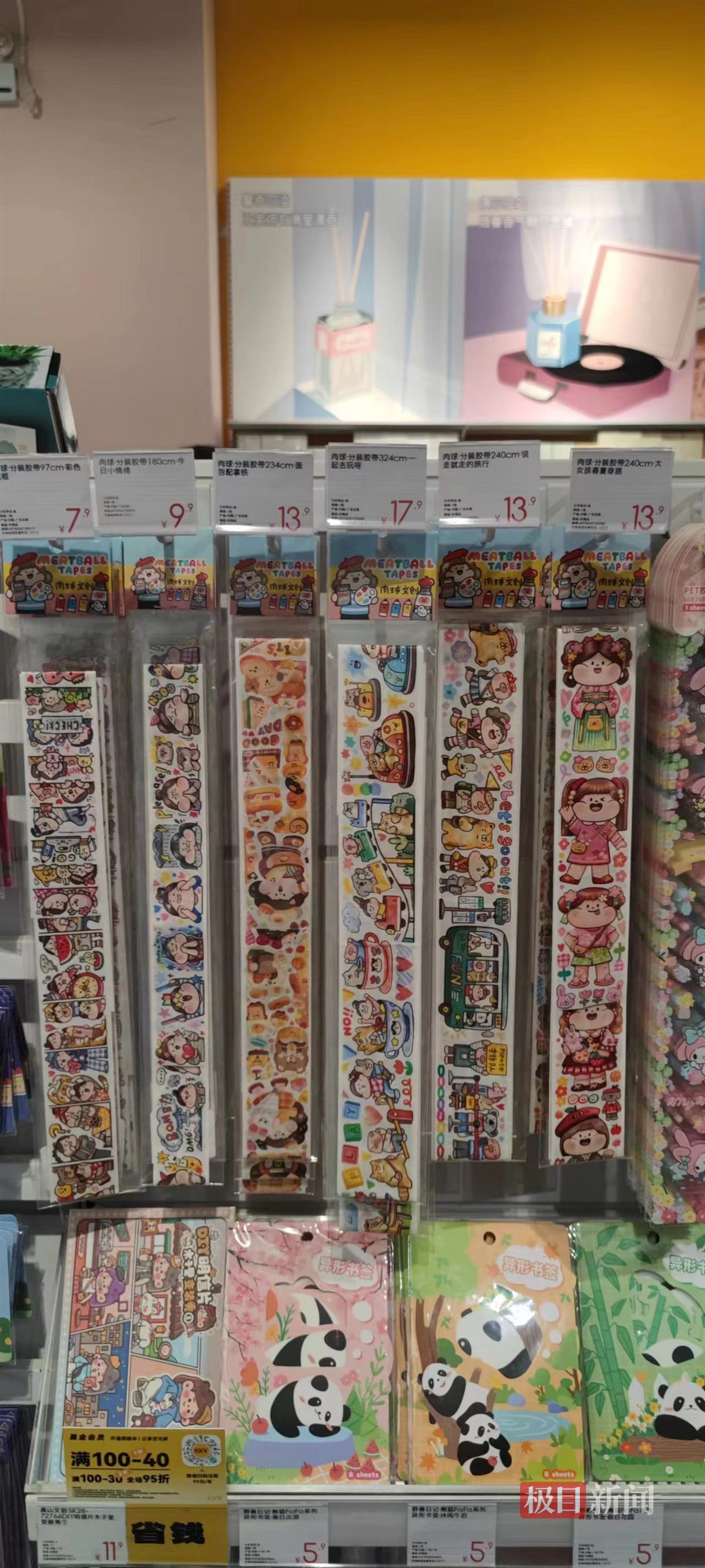 在位于汉街的KKV生活馆,一上二楼就可以看到多种文具,占店内面积约1/4。中性笔售价也从几元到十几元不等。修正带、手账胶带的价格在十几元左右。联名款的笔记本售价最高也可超过40元。在中南路外文书店一楼的文具店,4支颜色不同的中性笔套装售价75元。一款日本国誉品牌的笔袋售价116元。
