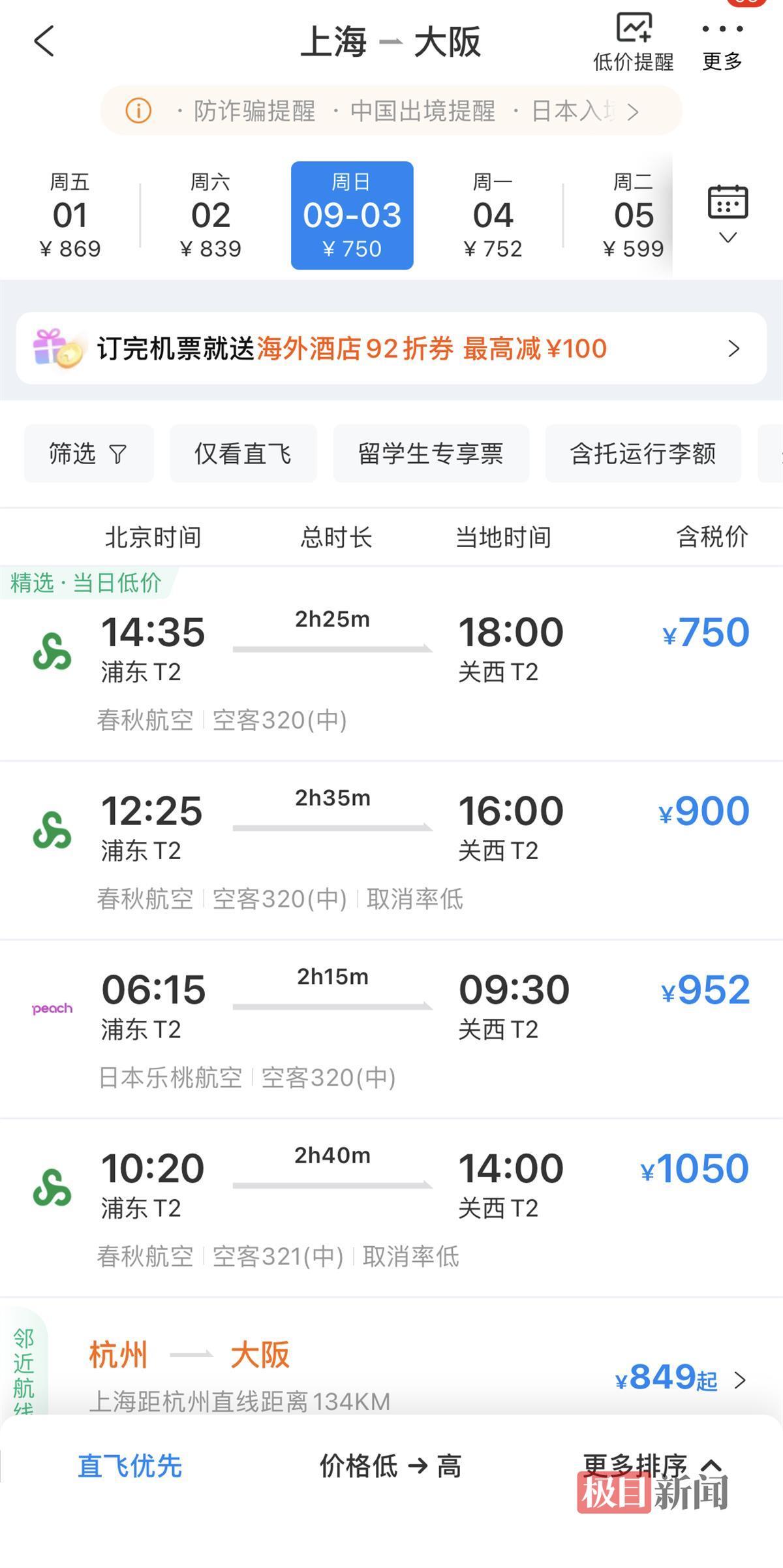 全国范围内,不少城市直飞日本的票价已经有所下降,但十一假期期间票价依然偏高。比如,9月上旬,上海直飞东京的票价多为千元左右;上海直飞大阪的票价最低为750元。9月上旬,北京直飞大阪的票价为1100元左右,北京直飞东京的票价均为2000元以上。