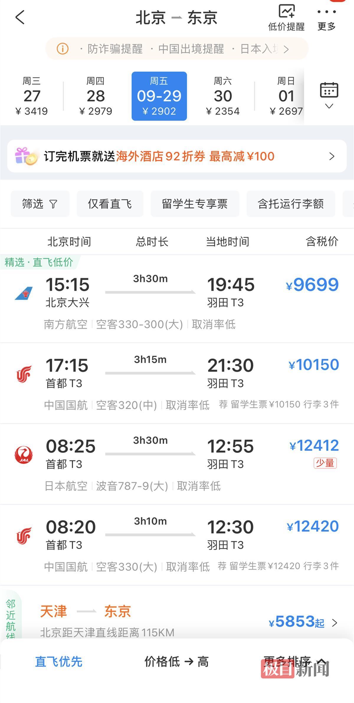 另一方面,单程上万元的机票依然存在。比如十一长假期间,北京直飞东京票价最高为10150元;日本航空9月29日从上海出发至东京的一班航班价格为14294元。