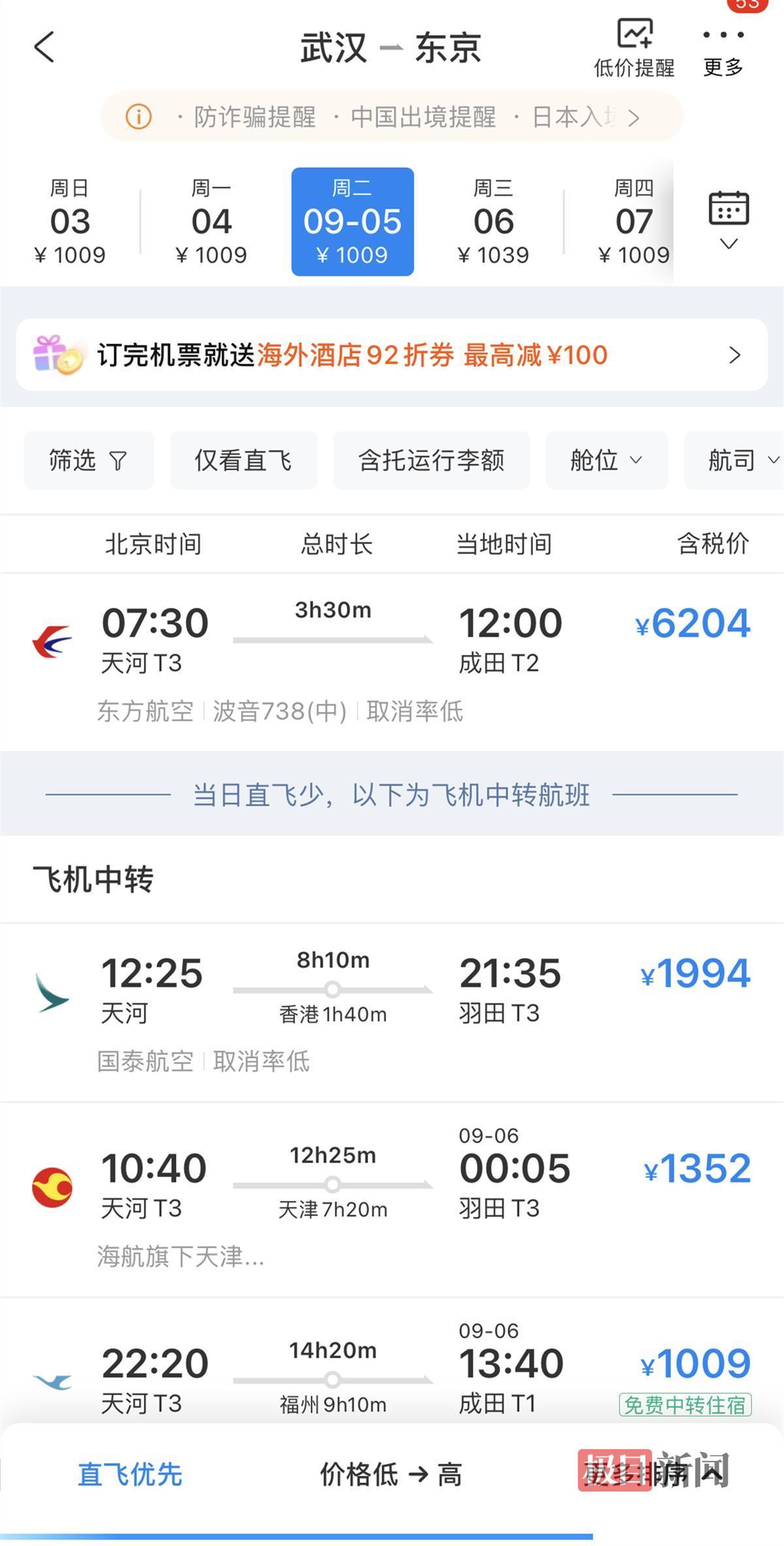 在机票预订平台上,下周二9月5日武汉直飞东京票价为6204元,下周六9月9日武汉直飞东京票价为3904元。十一假期中的9月30日票价为8654元,10月3日为4054元。