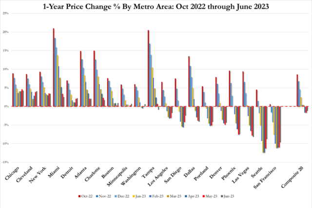 美国当前房价的一个显著特点是——地区差异明显。所谓的“铁锈地带”的城市表现优于美国其他地区。例如,6月芝加哥、克利夫兰的房价涨势领跑,中西部地区取代南方,成为美国房价表现最强劲的地方。纽约也表现居前。此前强劲的佛罗里达州的坦帕同比转跌,该州的迈阿密也有即将转跌的态势。旧金山和西雅图的房价同比跌幅最大。