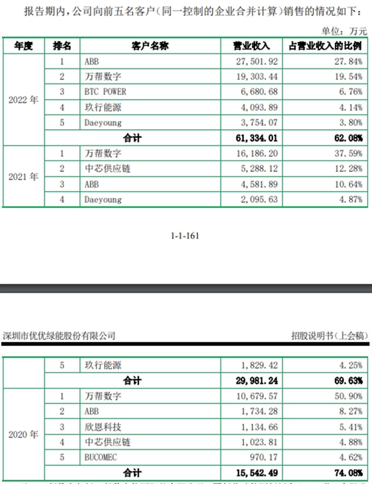 招股说明书显示,优优绿能前五大客户包括万帮数字、ABB、玖行能源等,其中万帮数字、ABB为公司股东,持股比例分别为2.67%和7.80%。报告期内,公司对万帮数字的销售金额分别为10679.57万元、16186.20万元和19303.44万元,占营业收入的比例分别为50.90%、37.59%和19.54%;公司对ABB的关联销售金额分别为1734.28万元、4581.89万元和27501.92万元,占营业收入的比例分别为8.27%、10.64%和27.84%。也就是说,这两家公司合计占当期营业收入的59.17%、48.23%、47.38%。