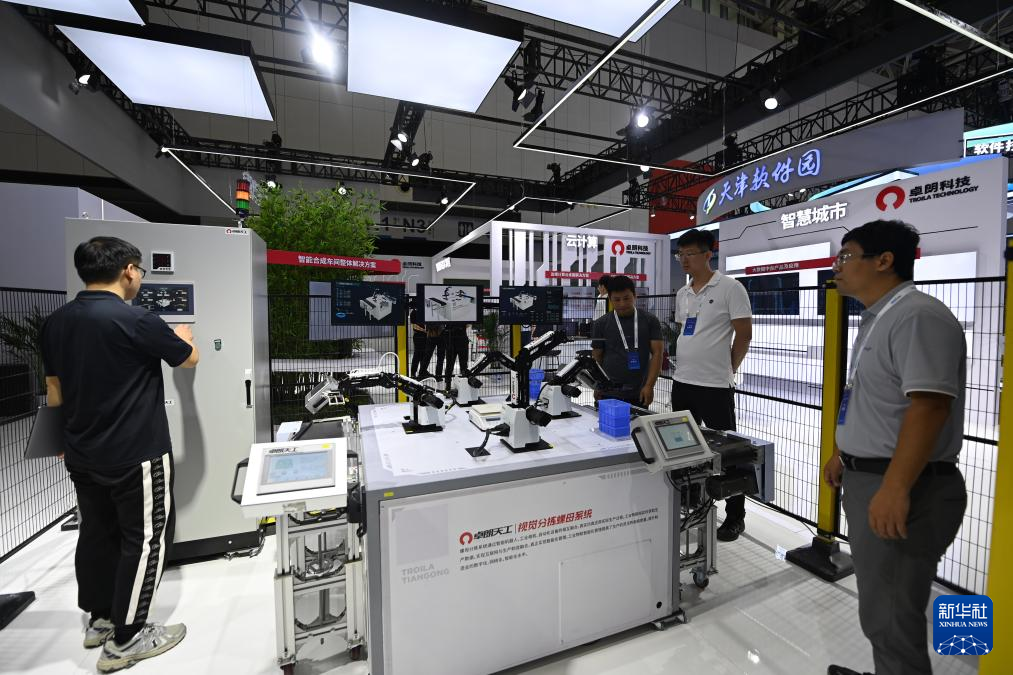 8月31日,参会人员在第二十五届中国国际软件博览会软件成果展上演示视觉分拣螺母系统。