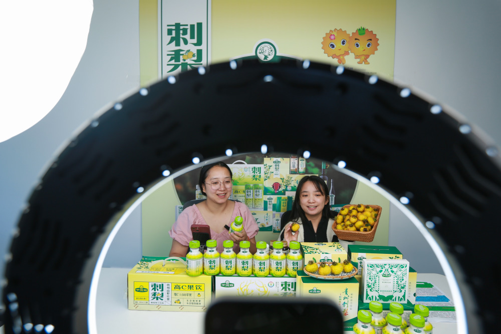 9月1日,在贵州省龙里县谷脚镇茶香村刺梨展销中心,当地政府工作人员与刺梨基地工作人员直播推介刺梨产品。新华社发(肖伟 摄)