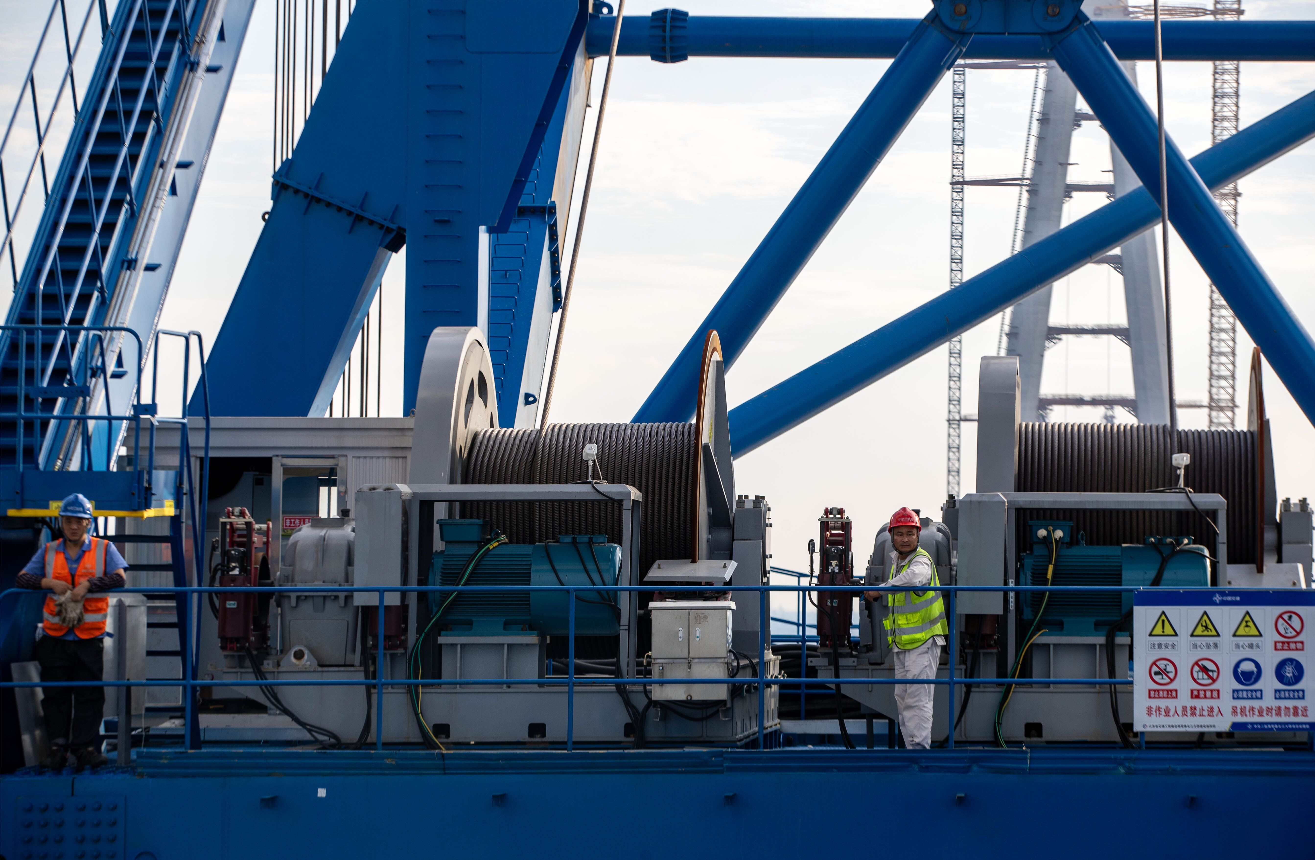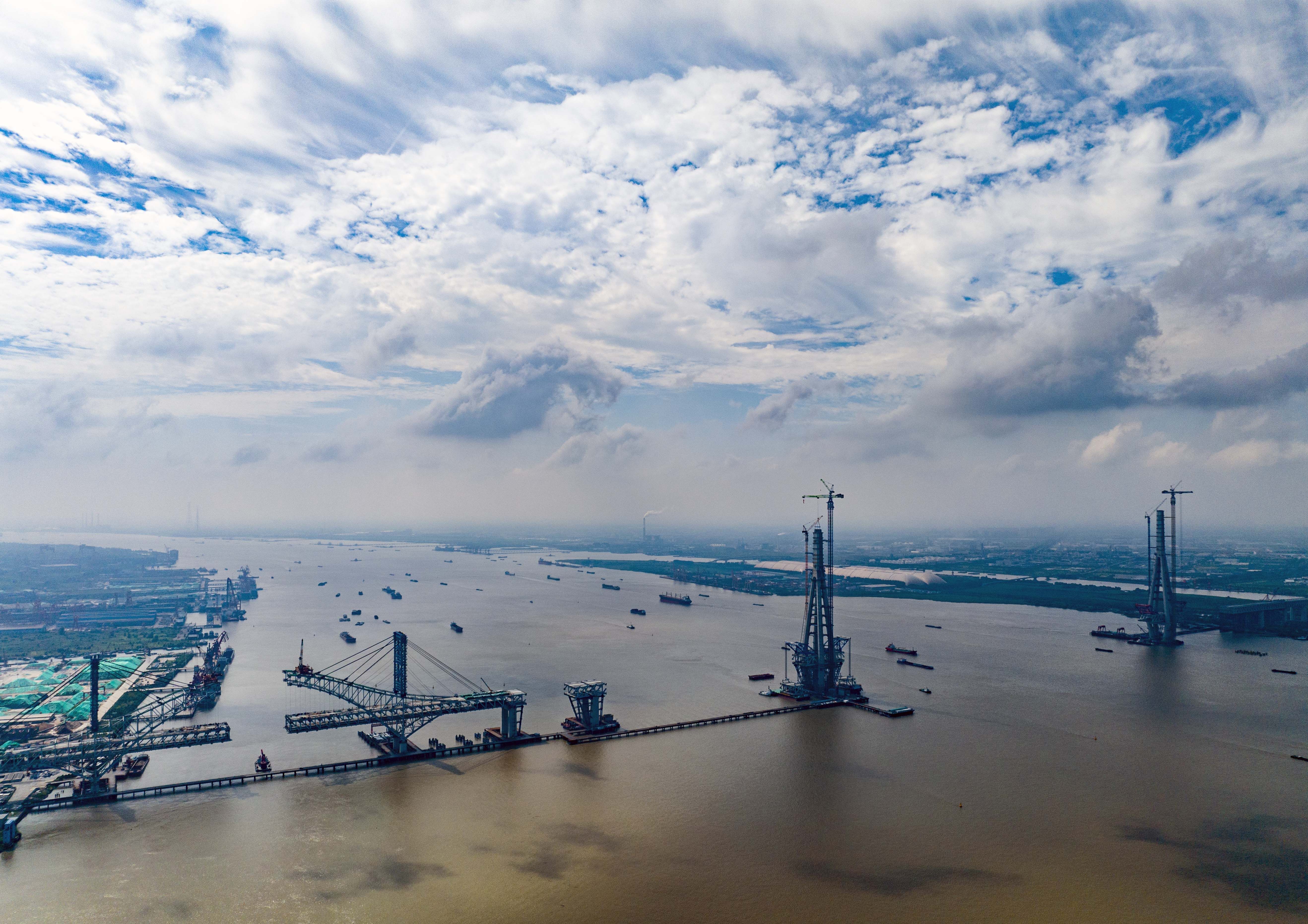 2023年9月2日,中交二航局建设者在常泰长江大桥主航道桥泰州侧施工现场进行钢桁梁悬臂架设。
