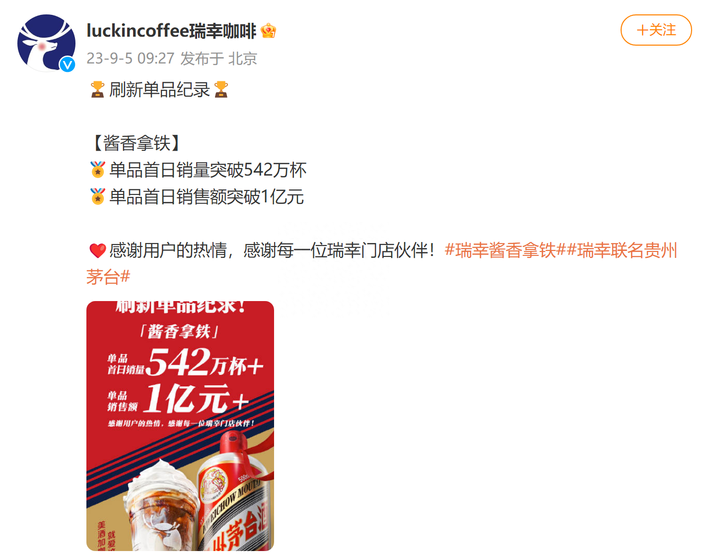 瑞幸酱香拿铁首日销售数据出炉:销量542万杯,销售额破1亿元