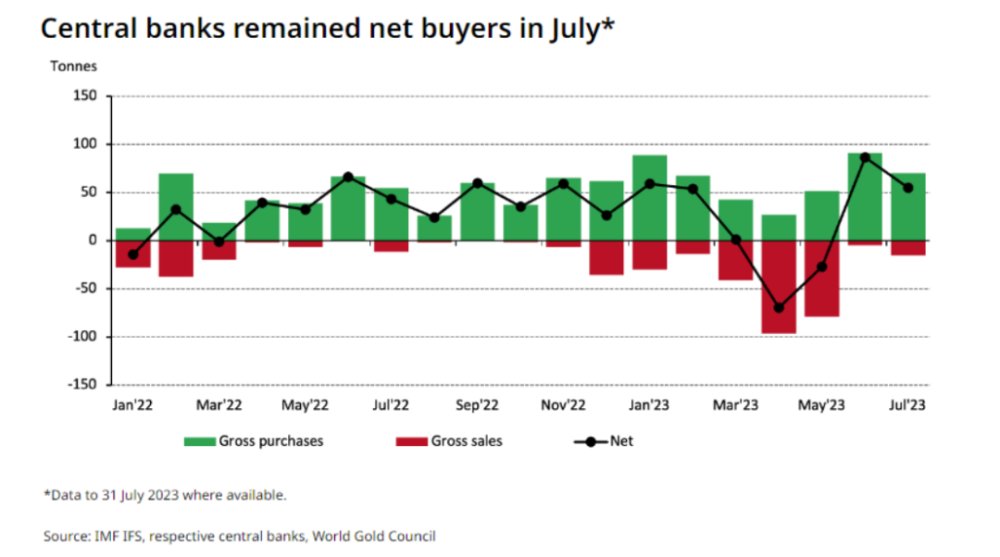 世界黄金协会指出,7月购金依旧多于售金,但售金量仍然可观,一些央行的进一步售金行为不应当被忽视。据了解,哈萨克斯坦国家银行已提前表示计划在今年年底前进一步削减其黄金储备。