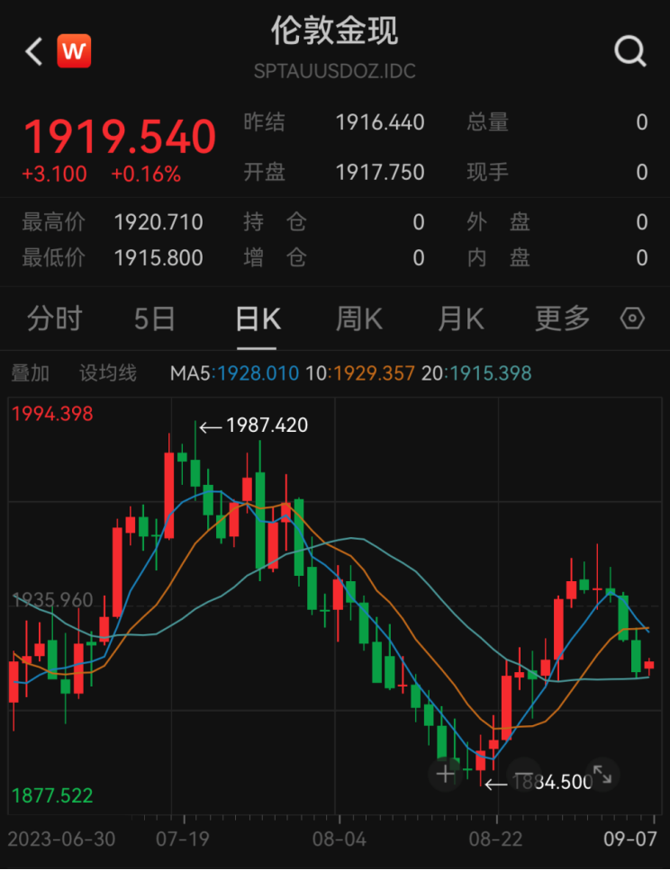 从金价表现来看,9月以来金价有所震荡回落。北京时间9月7日,伦敦金现开于1917.75美元/盎司,最高上探至1920.71美元/盎司,最低触及1915.8美元/盎司,截至发稿前,报1919.54美元/盎司。较5月初的历史高位跌幅近8%。