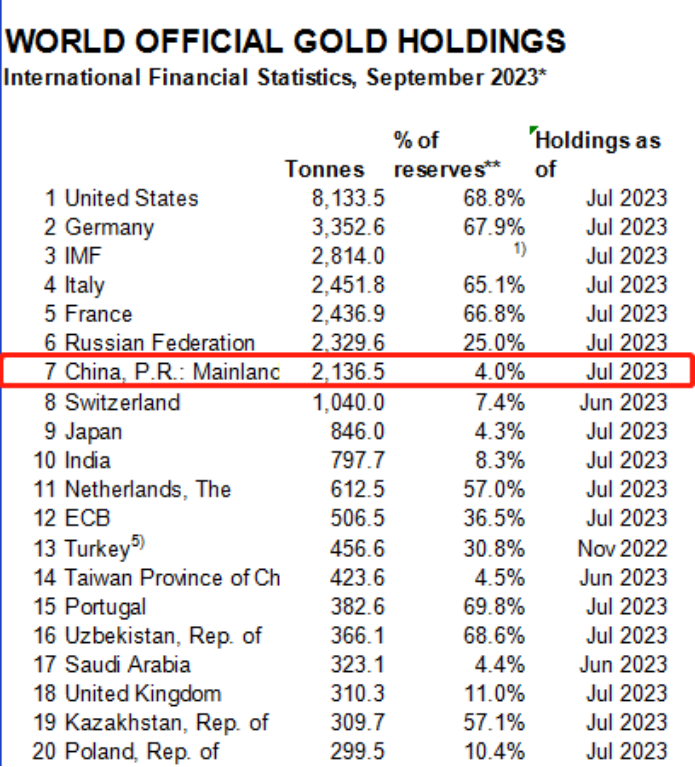 根据世界黄金协会9月公布的最新数据,截至7月末,黄金储备较多的美国、德国、意大利、法国、俄罗斯五个国家,其黄金储备占总储备比分别为68.8%、67.9%、65.1%、66.8%、25%。我国央行黄金储备排在第7位,占总储备比却仅有4%。