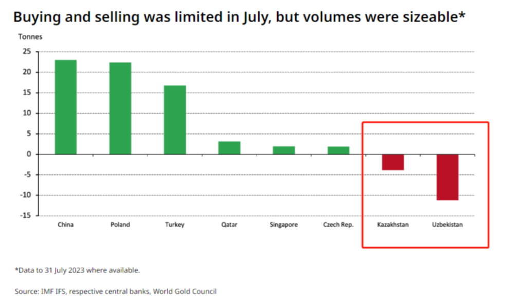 售金方面,数据显示,乌兹别克斯坦中央银行和哈萨克斯坦国家银行是7月仅有的两家显著售金的央行,分别卖出了11吨和4吨,而这两家央行此前也已多次售金。