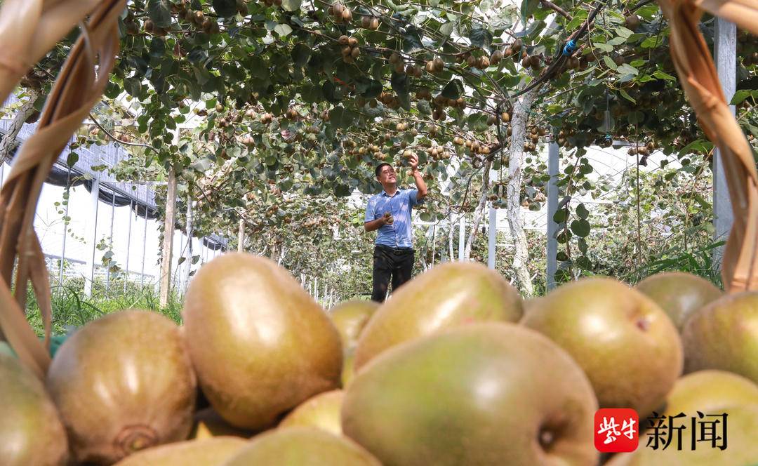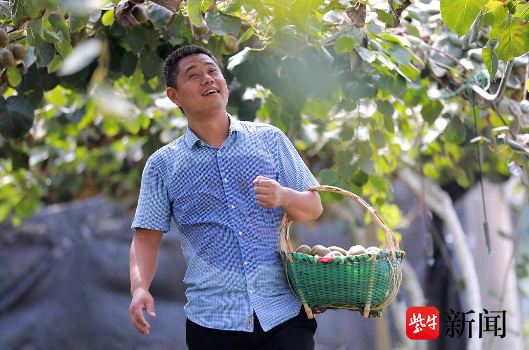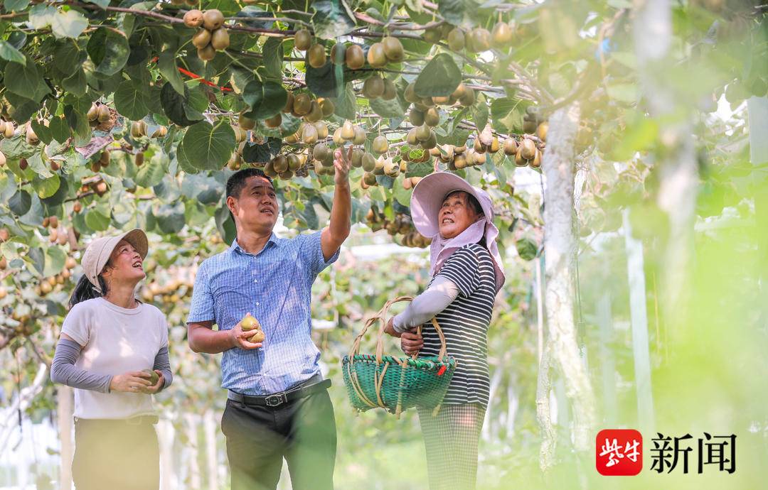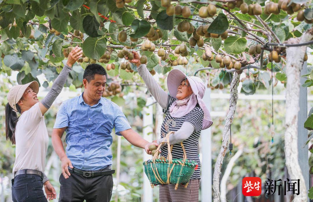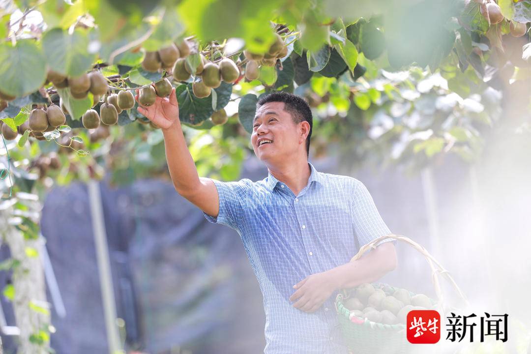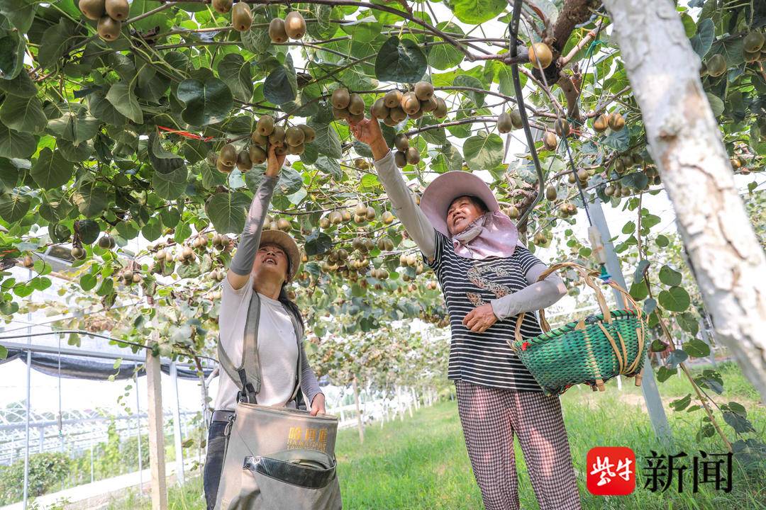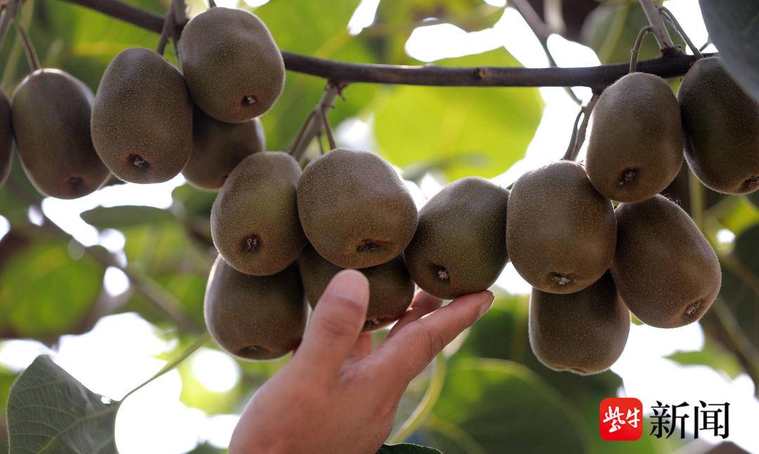 9月6日,在句容边城镇东篱家庭农场猕猴桃种植果园里,只见一根根藤蔓上,挂满了圆润饱满的猕猴桃。工作人员穿梭在藤架下,仔细挑选果实。