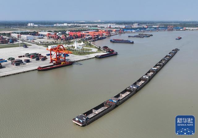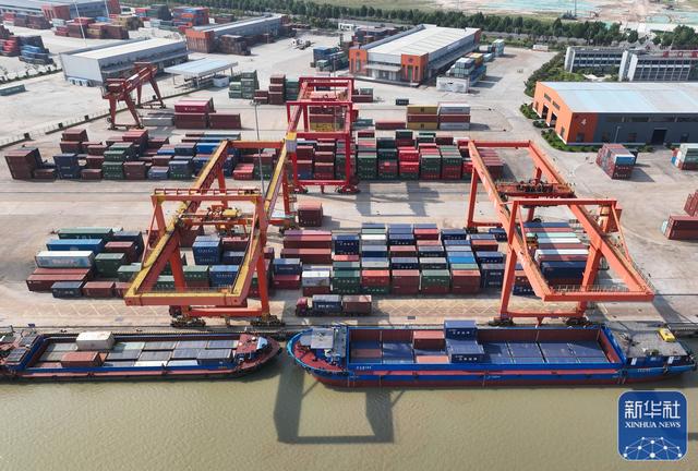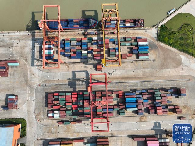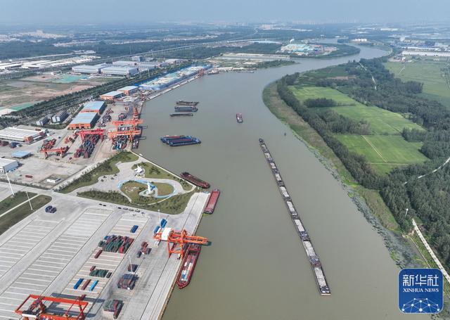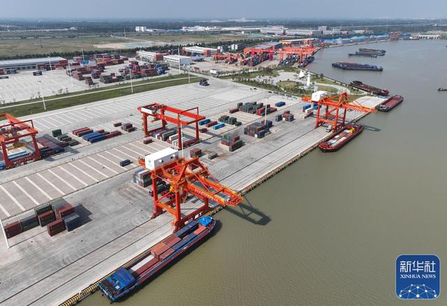↑9月10日拍摄的运河宿迁港集装箱码头(无人机照片)。