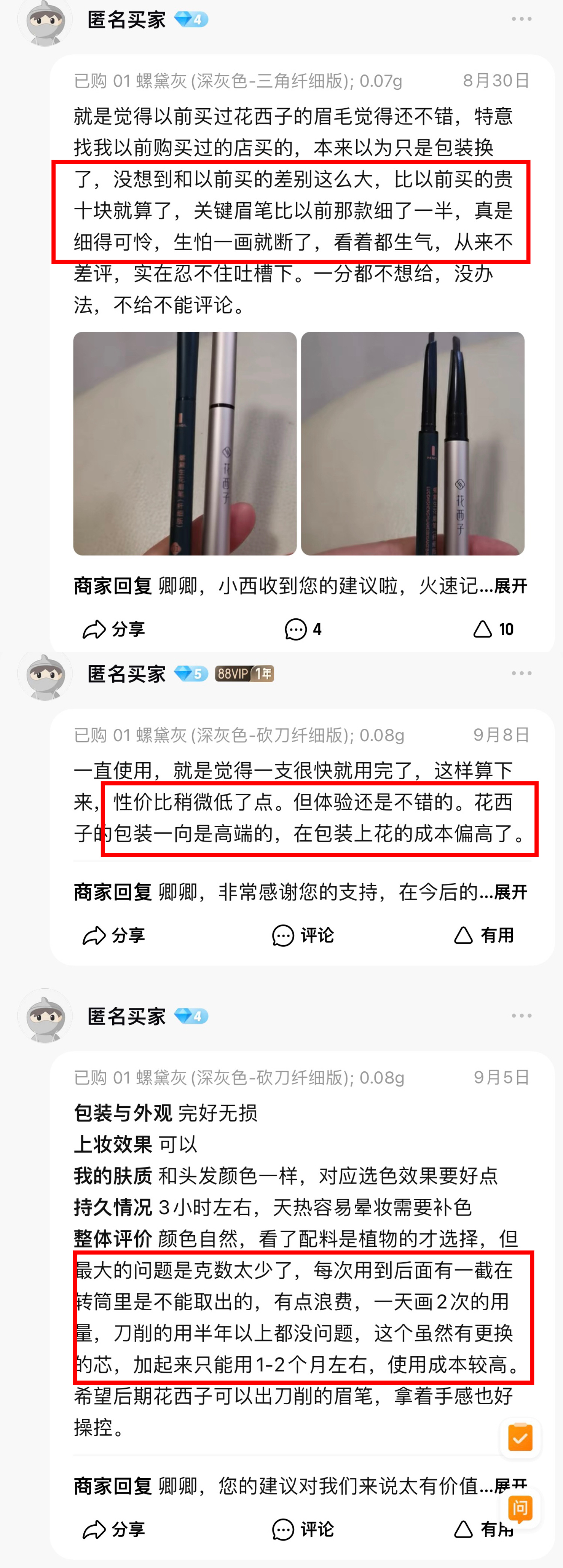 “一直使用,一支很快就用完了,性价比稍微低了一些。包装是高端的,在包装上花的成本偏高了。”“最大的问题是克数太少了,虽然有替换芯,但加起来只能用1-2个月,使用成本较高。”“比以前买的贵十元也就算了,眉笔比以前那款也细了一半。”记者翻阅花西子电商旗舰店的用户评论,发现很多消费者抱着支持国货的心购买国潮彩妆,但购买体验却并不理想。与精致的外包装相比,消费者更关注的还是产品的实际品质。