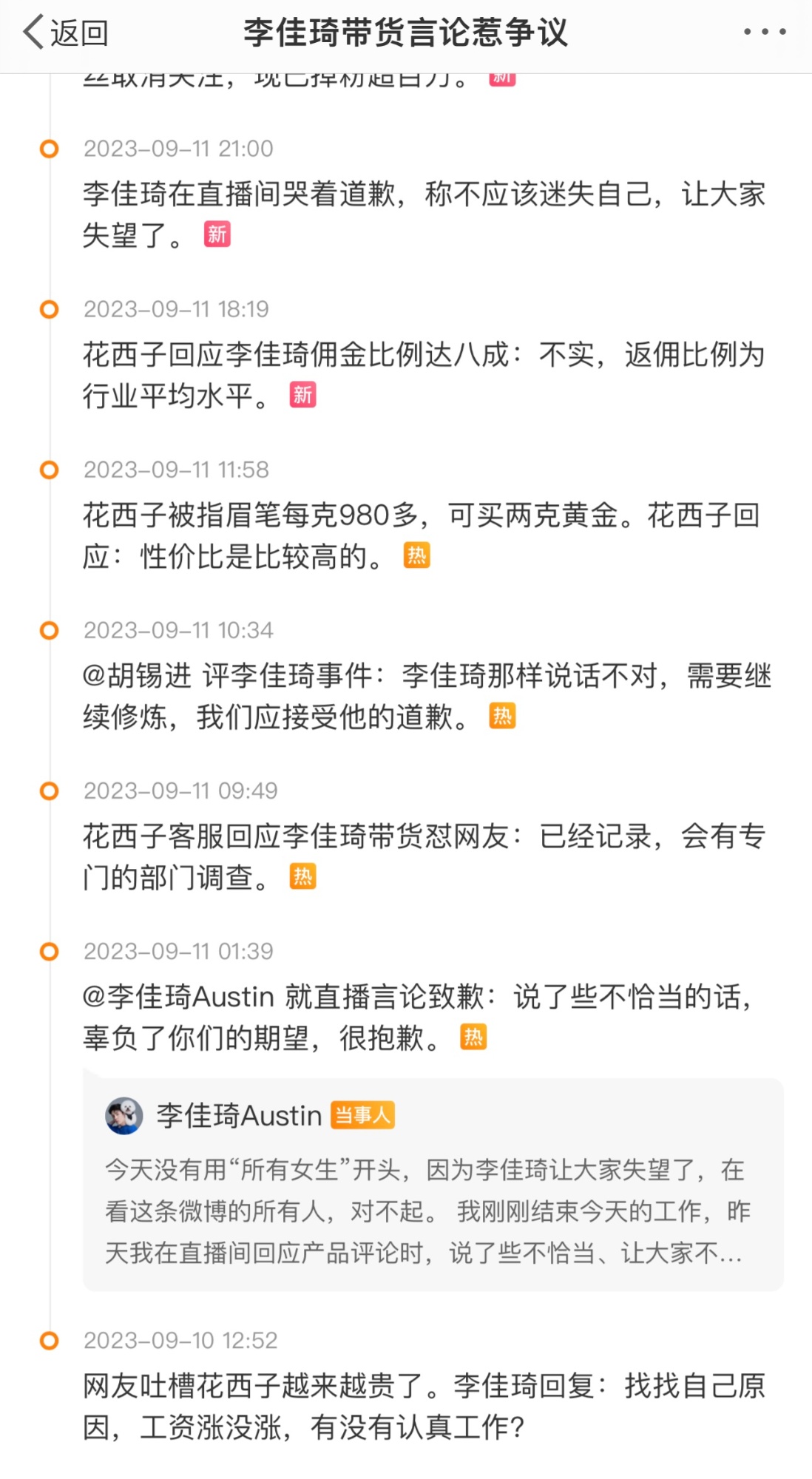 “李佳琦带货言论引争议”事件时间线(央广网发图源:网络平台)