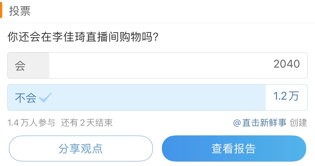 微博平台“你还会在李佳琦直播间购物吗”投票数据(央广网发记者截图)