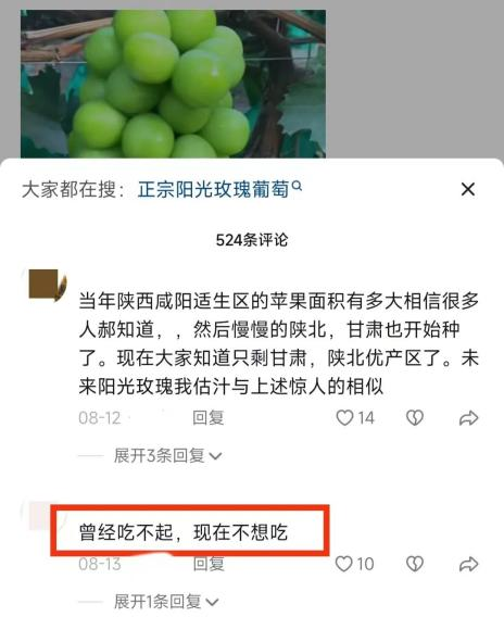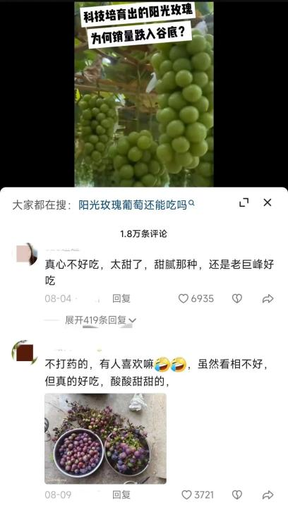 也有网友表示对阳光玫瑰葡萄的新鲜感逐渐降低,曾经因价格高昂而无法品尝的人们如今也不再感到渴望。产品的热度与价格上涨密切相关,阳光玫瑰曾因其独特的外观吸引了许多消费者,尤其是追求高品质生活的年轻人。然而,随着几年的发展,阳光玫瑰已不再是新品种,曾经的奢侈品如今已成为普通商品,价格自然不复从前了。当然,市场消费力和礼品市场的热度跟不上产量提升也是其中的因素。口感大跌,也是一个重要原因。