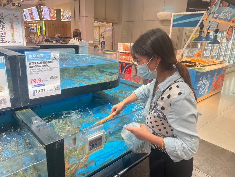 这些虾是南美白对虾,也就是我们俗称的基围虾。以往,重庆市民想要吃到海虾,最近的产地就是广东湛江,要经过1200公里的长途运输才能到达重庆,虾早已进入休眠状态,鲜活度不高。据某生鲜平台重庆区域商品总监李多思介绍,店里出售的这些海虾的鲜活度却是极高的,每次顾客挑选时店员们都会担心虾从池子里蹦出来。这又是怎么回事儿呢?“从北海和湛江到重庆的虾算是比较近的,在途的时间差不多要12个小时,基本上到了我们内陆城市,基围虾的活度都会打折扣。在我们的门店,到了下午的四五点钟就没有活虾在卖了,从大足到我们的门店运送过去的时间只需要一个半小时,直接到我们门店就可以直接到用户的手中了,这就意味着用户在下午的五六点钟依然可以买到活虾,这个是沿海虾做不到的。”