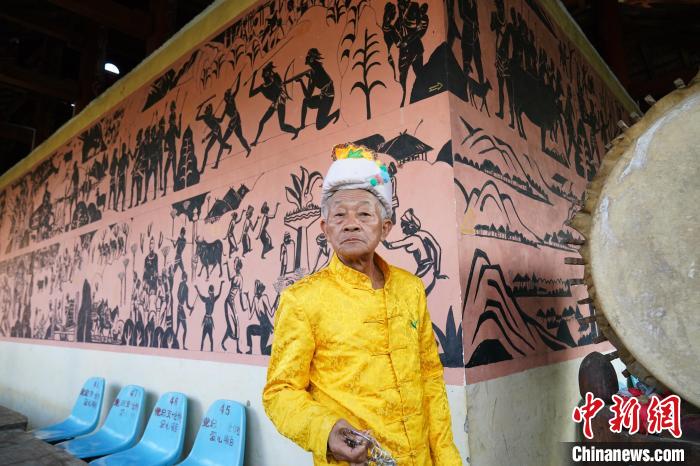 9月15日,苏国文站在由其策划绘制的布朗族历史墙壁绘画前。 中新社记者刘冉阳摄